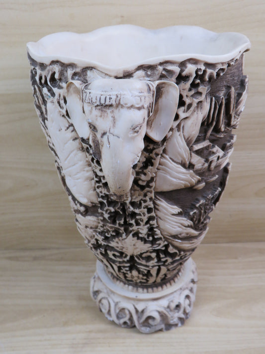 vecchio VASO ORIENTALE CON TESTE DI ELEFANTI colore avorio inciso personaggi di