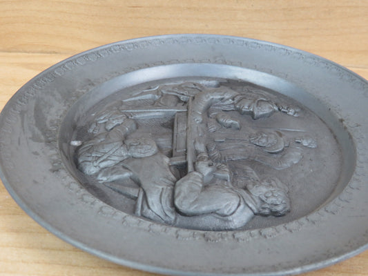 vecchio PIATTO IN PELTRO DECORATO UOMINI GIOCANO A CARTE OSTERIA rilievo vintage