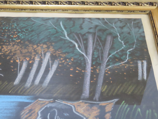 vecchio quadro disegno a mano su carta gessetto SCENA DI CACCIA IN PALUDE cani