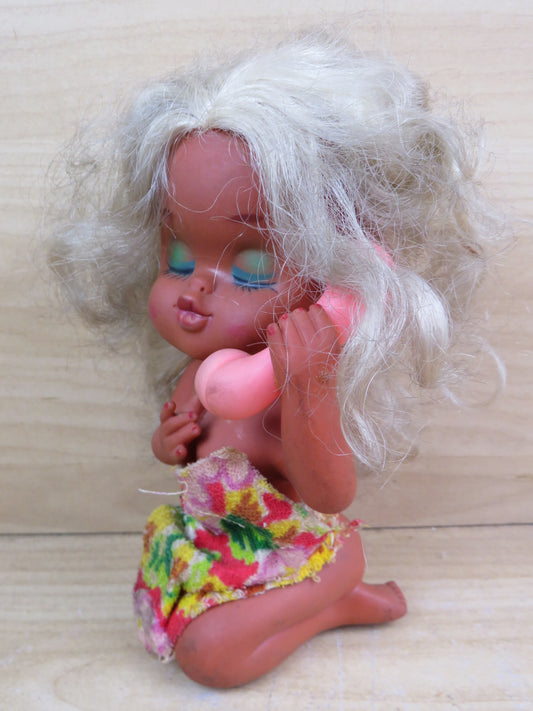 vecchia BAMBOLA DI GOMMA SEDUTA CON TELEFONO MADE IN HONG KONG capelli biondi