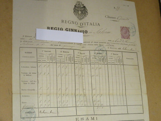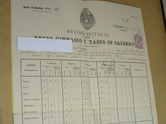 old school report card REGIO GINNASIO TORQUATO TASSO SALERNO 1881 1882 fifth