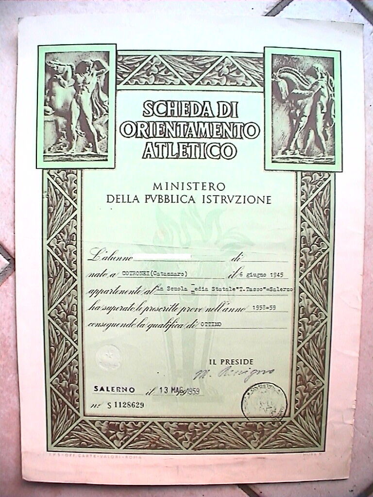 -- (ScuolaSportSalerno) ATHLETIC ORIENTATION CARD. Ministry of Public Education. Tasso Middle School of Salerno. Passed the required tests in the year 1958 - 59. Measures 27x36 cm. You will receive what you see.