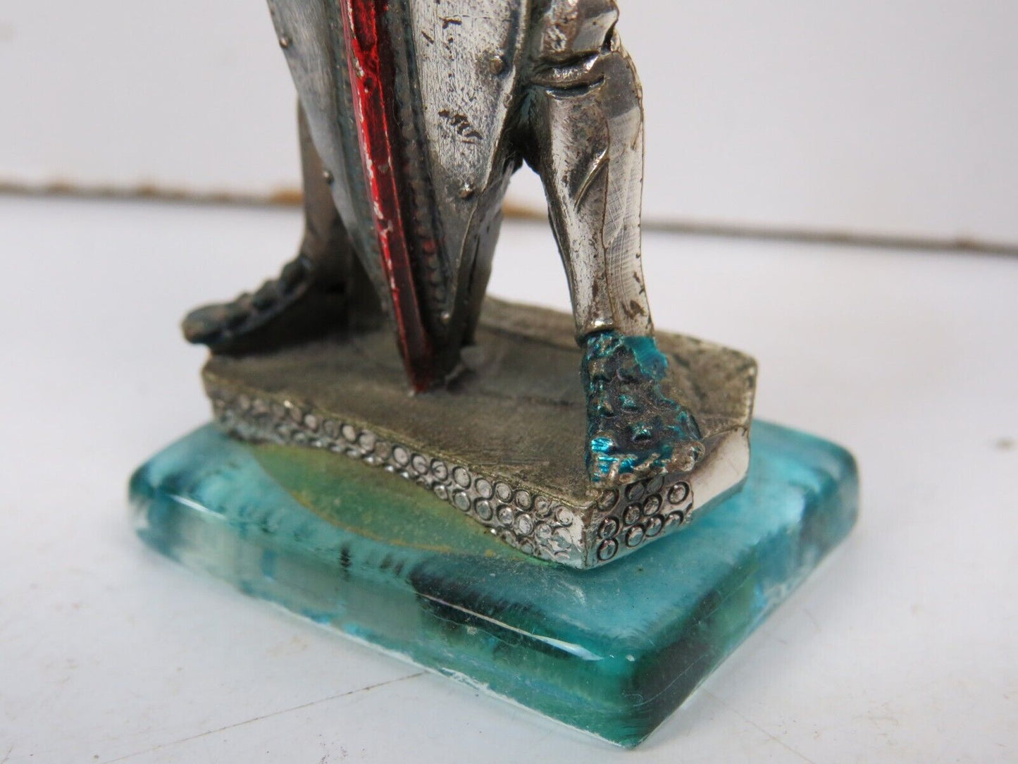 old KNIGHT FIGURINE ARMOR SILVER LAMINATED glass base miniature