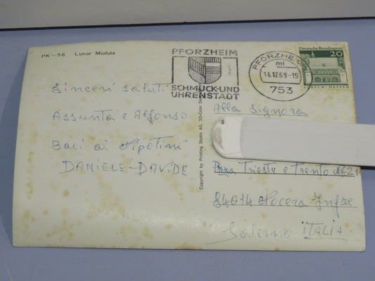 vecchia CARTOLINA EFFETTO 3D PK-56 MODULO LUNARE E ASTRONAUTA sulla luna vintage