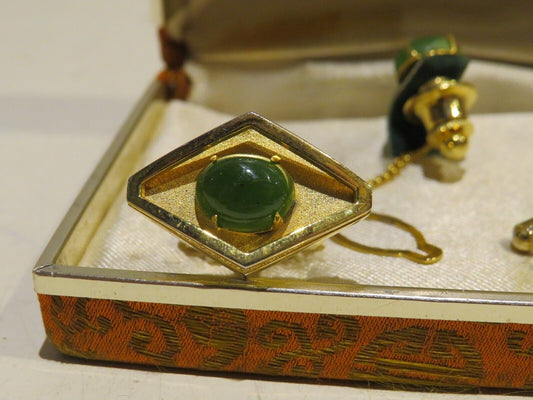 box with BROOCH CUFFLINKS TAIWAN JEWELERY green stone gold color vintage