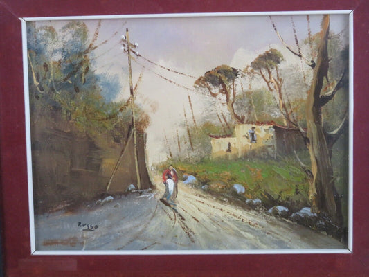 old hand painted painting in frame WAYFARER IN THE WOODS HOUSE ROAD RUSSIAN