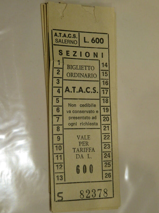 Vecchio biglietto FILOBUS AUTOBUS Filovia ATACS Salerno 600 lire Corsa Ordinario