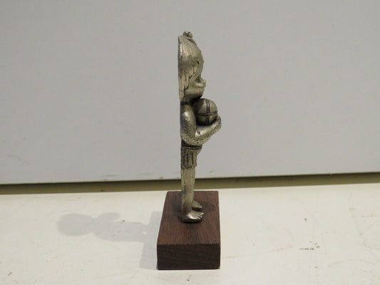 vecchia STATUETTA IN PELTRO BAMBINO CON PALLONE CAPPELLO base in legno vintage