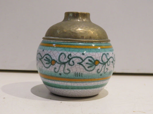vecchio CALAMAIO IN CERAMICA E ARGENTO 800 disegni foglie dipinto vintage di