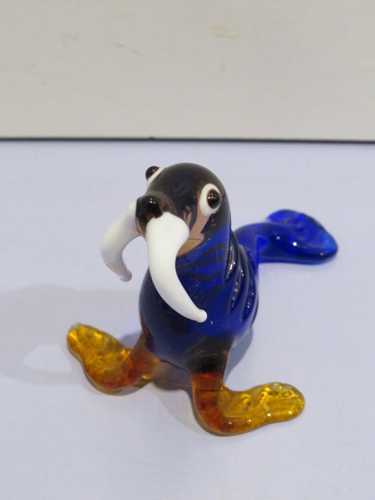 vecchia STATUETTA TRICHECO IN VETRO DI MURANO BLU E ARANCIO foca vintage di
