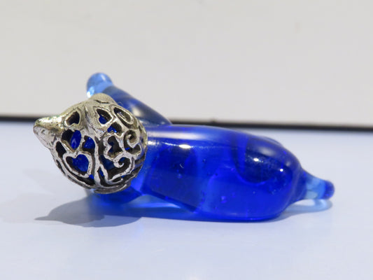vecchia MINIATURA STATUETTA GATTO CON PALLINA IN VETRO DI MURANO BLU E METALLO