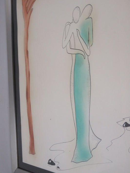 vecchio quadro dipinto in cornice di GINDEL INNAMORATI DIETRO ALBERO a matita da