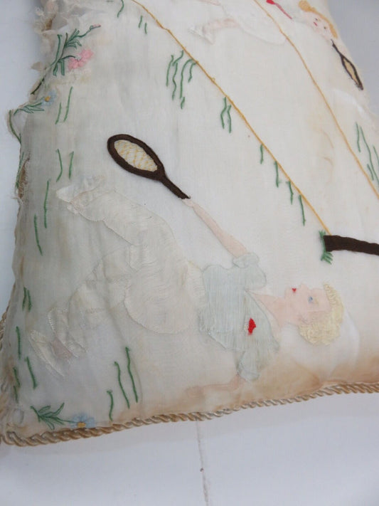 coppia di ANTICHI CUSCINI PER NEONATO BAMBINO ricamati con figure tennisti oche