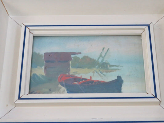 vecchio quadro dipinto a mano in cornice BARCA DI PESCATORI capanno laguna CERRI
