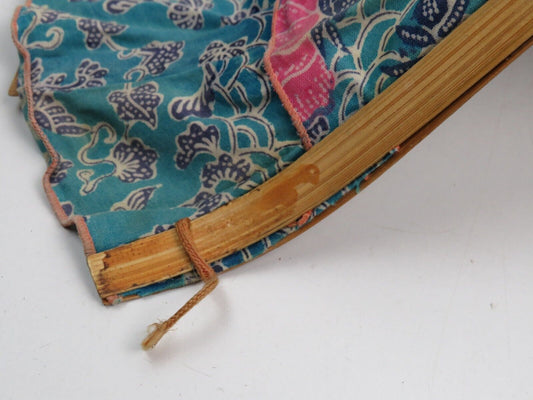 antico VENTAGLIO SAGOMATO IN STOFFA E LEGNO a fiori in stile Liberty anni 40 50