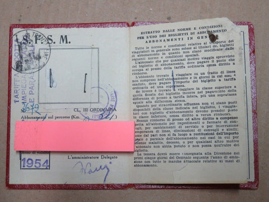 vecchia tessera STRADE FERRATE SECONDARIE MERIDIONALI NAPOLI 1954 abbonamento